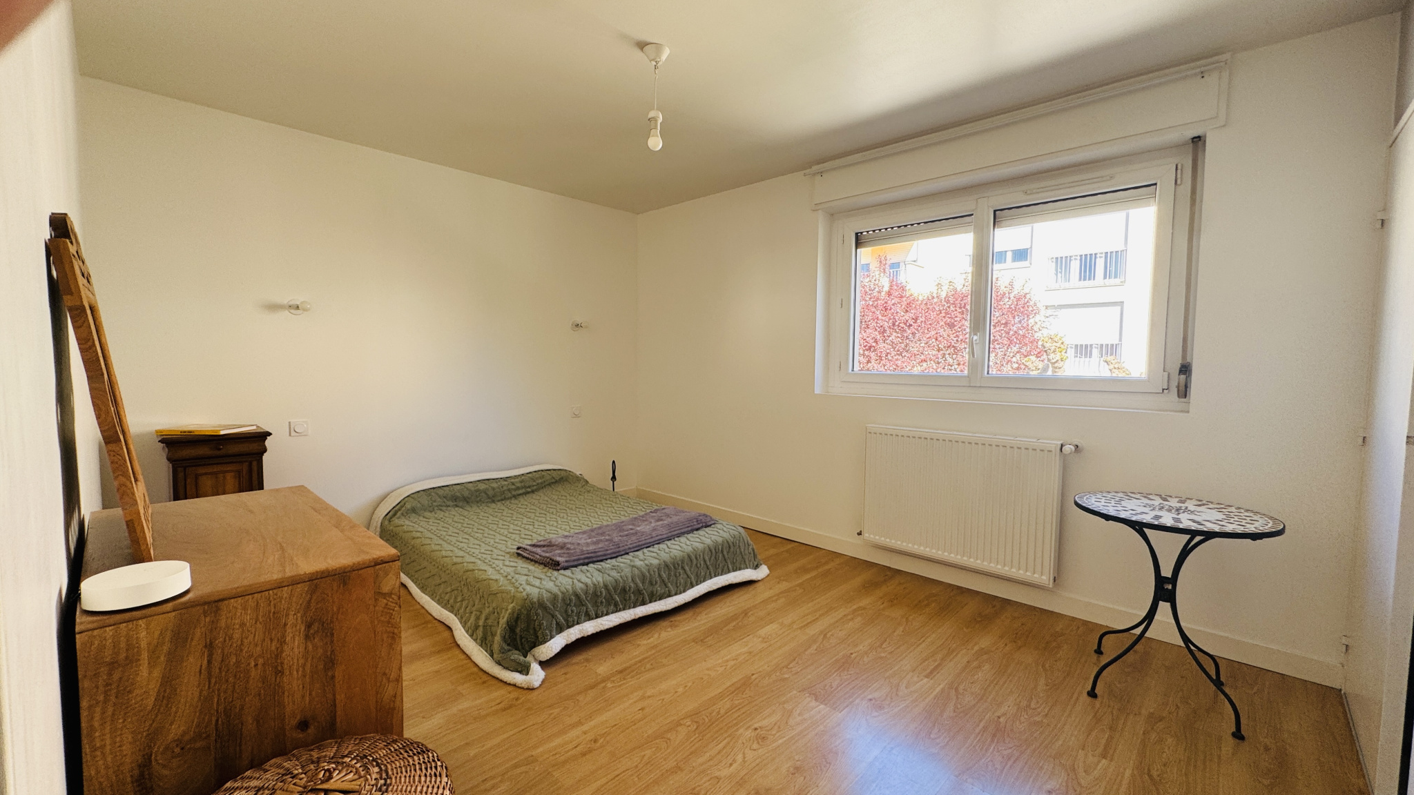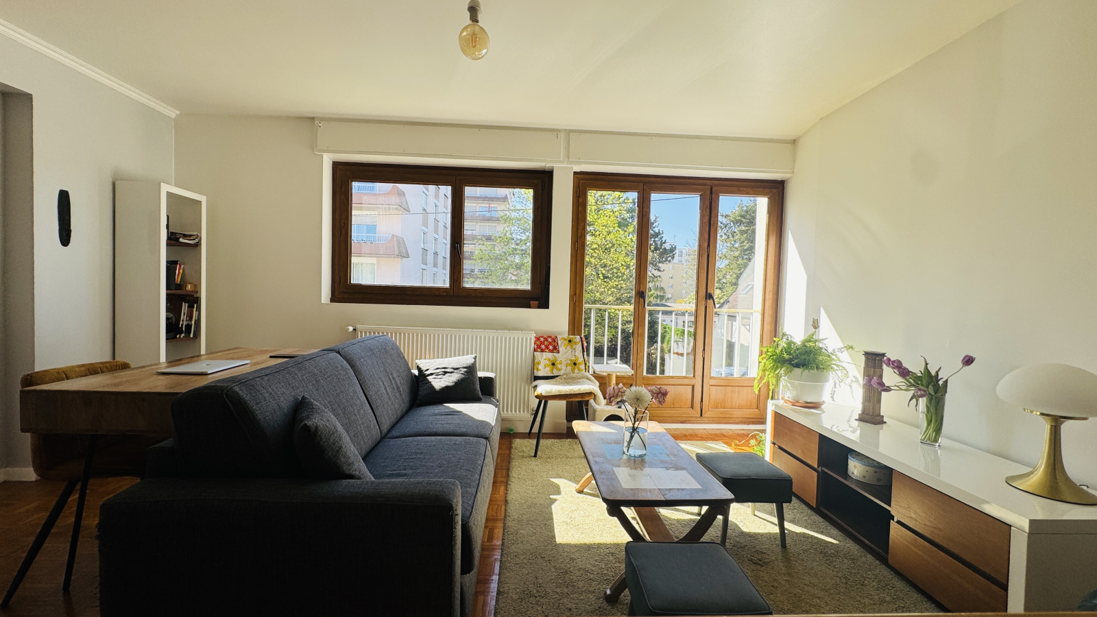 L’appartement offre une agréable pièce de vie lumineuse avec une cuisine semi-ouverte entièrement équipée, trois chambres confortables, ainsi qu’une salle d’eau fonctionnelle.