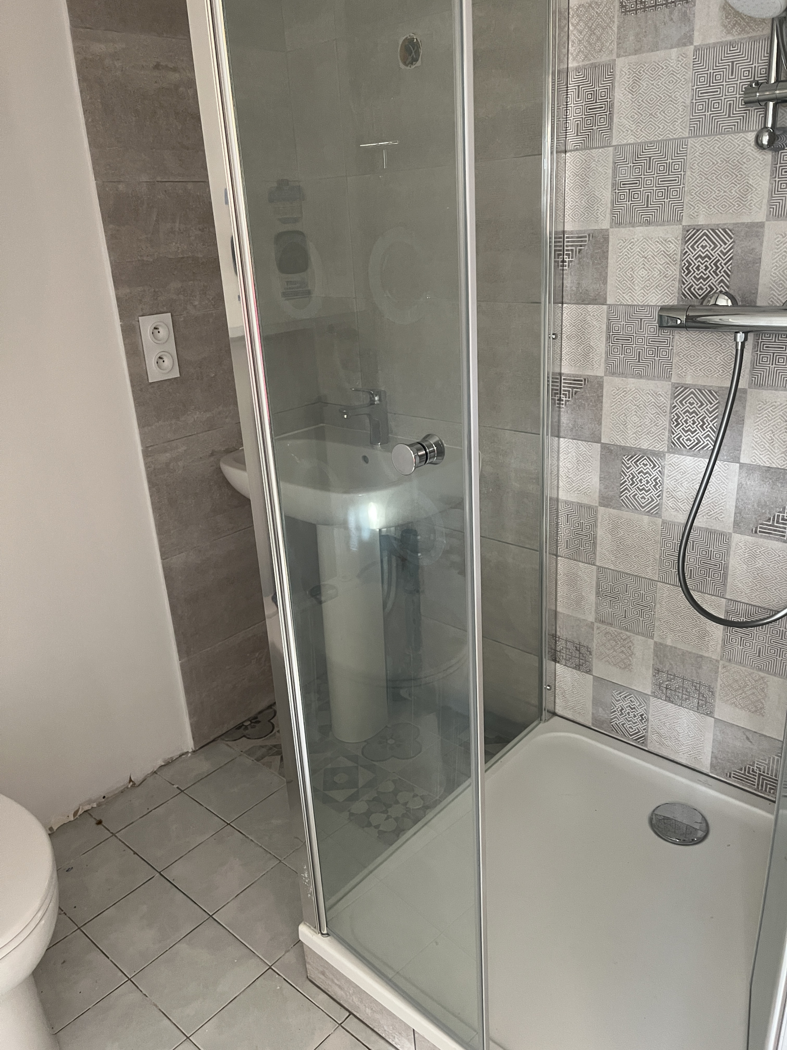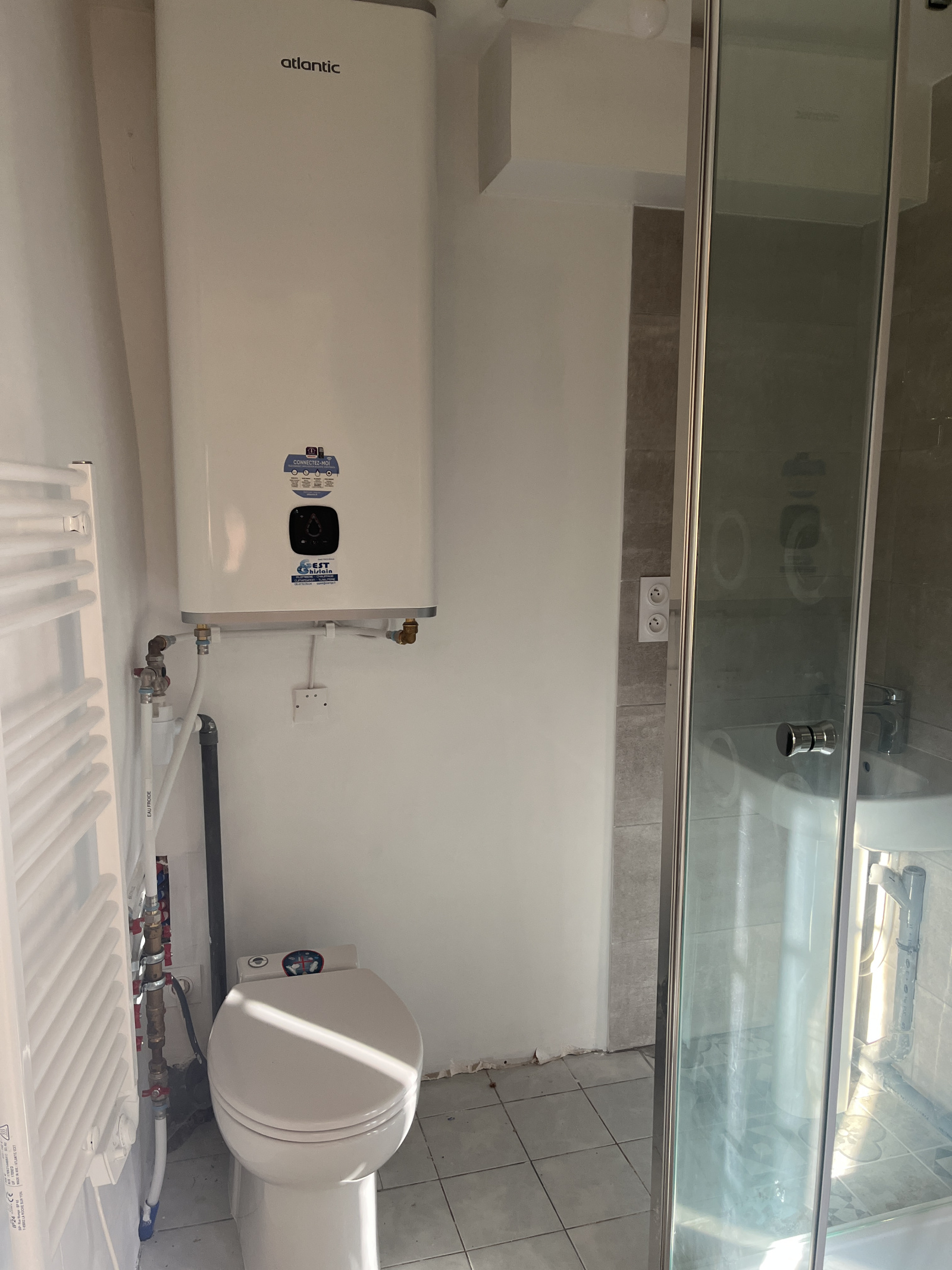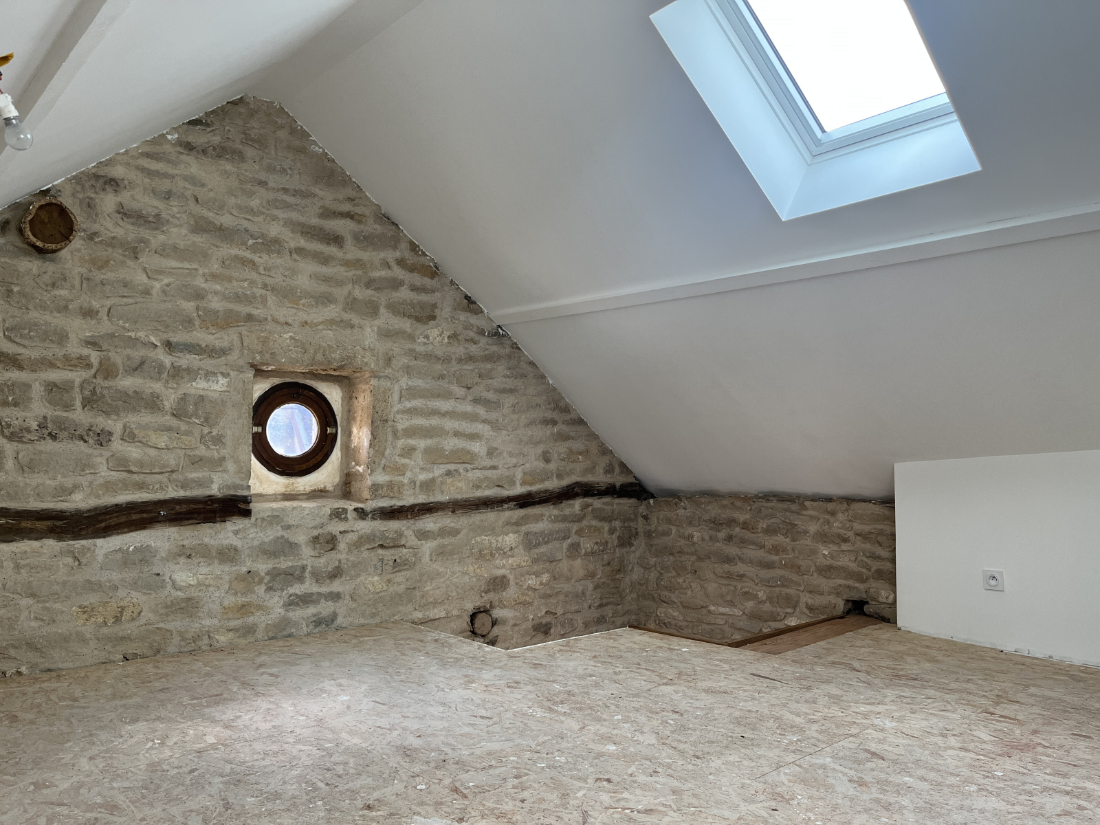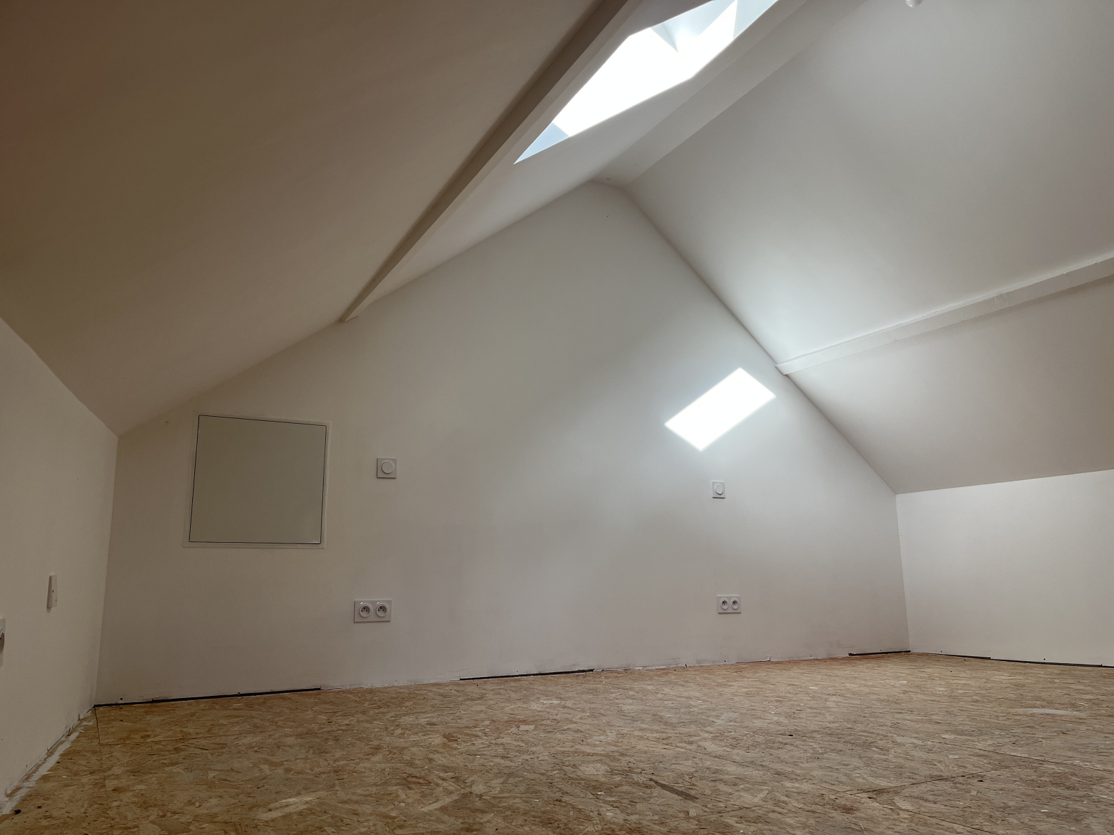 À l'étage, le plateau dispose d'une jolie salle de douche avec WC sanibroyeur, et plus de 13 m2 pour la future cuisine dînatoire. Il y aussi un accès sur l'extérieur à ce niveau. Le coin nuit se trouve au second étage, où le plateau mansardé permet d'aménager une confortable chambre.