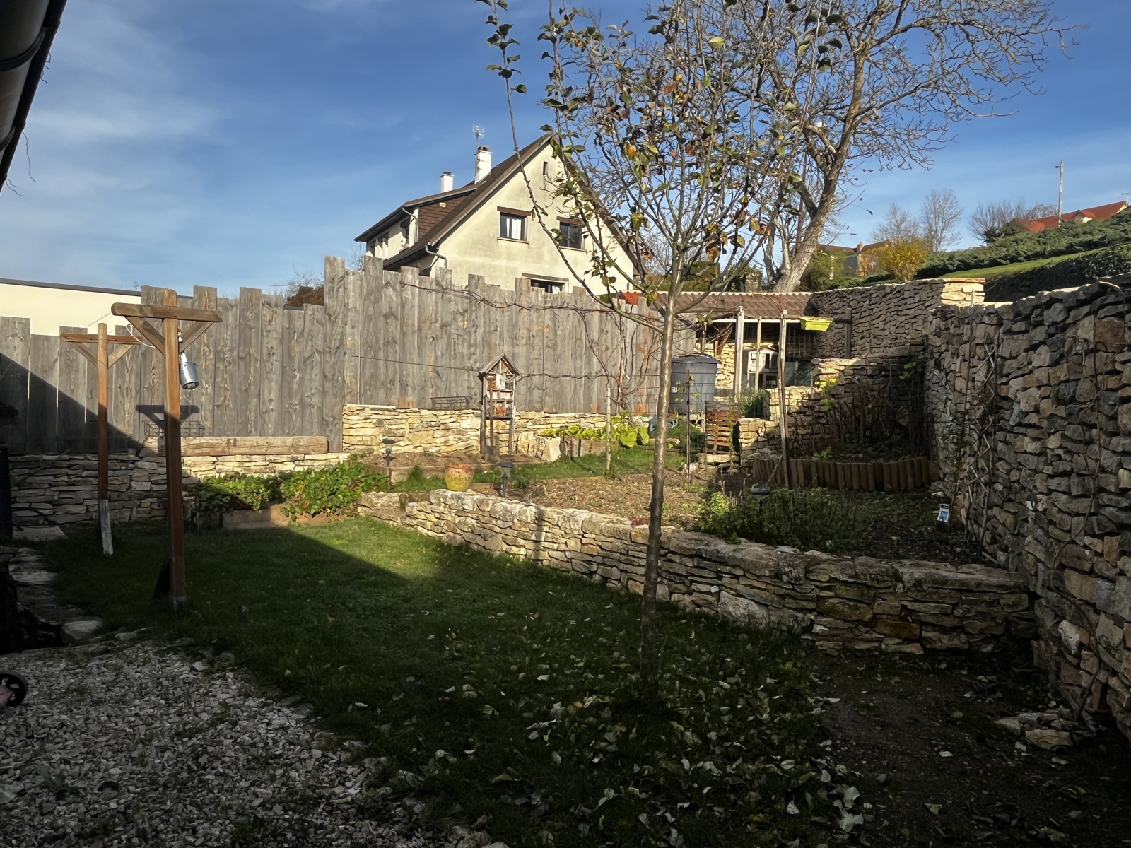 La maison est également sublimée par deux espaces extérieurs (deux jardins) : l'un accessible depuis la cuisine avec une belle terrasse, et l'autre accessible depuis la grange, plus adapté à un potager et avec un poulailler.