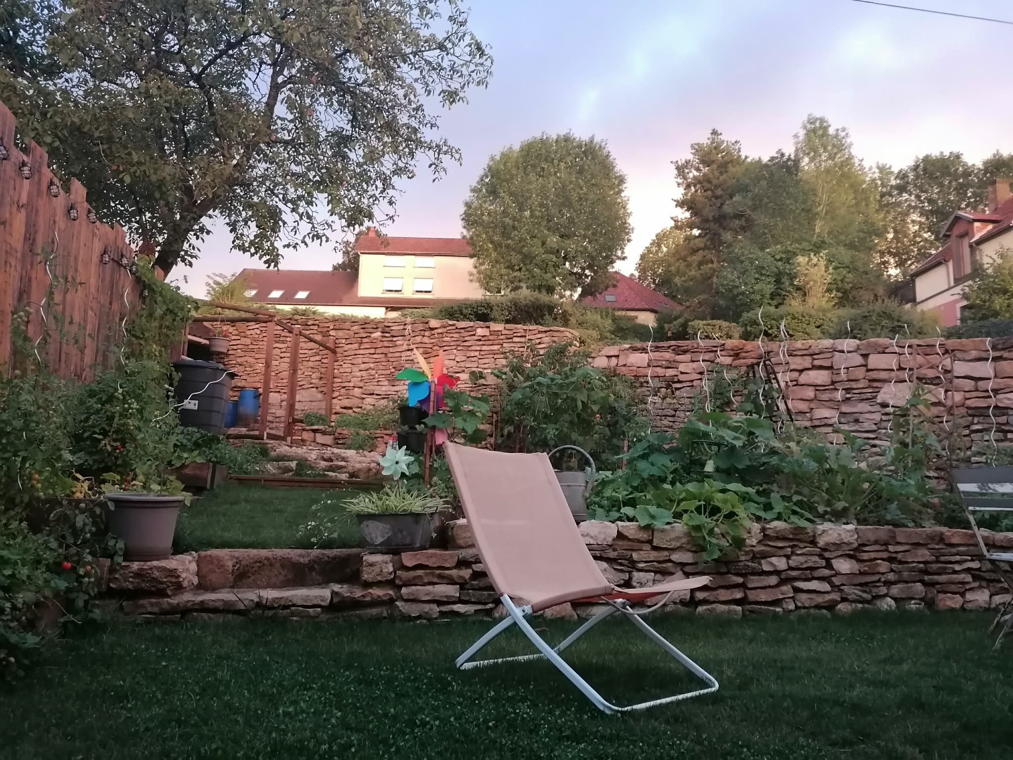 La maison est également sublimée par deux espaces extérieurs (deux jardins) : l'un accessible depuis la cuisine avec une belle terrasse, et l'autre accessible depuis la grange, plus adapté à un potager et avec un poulailler.