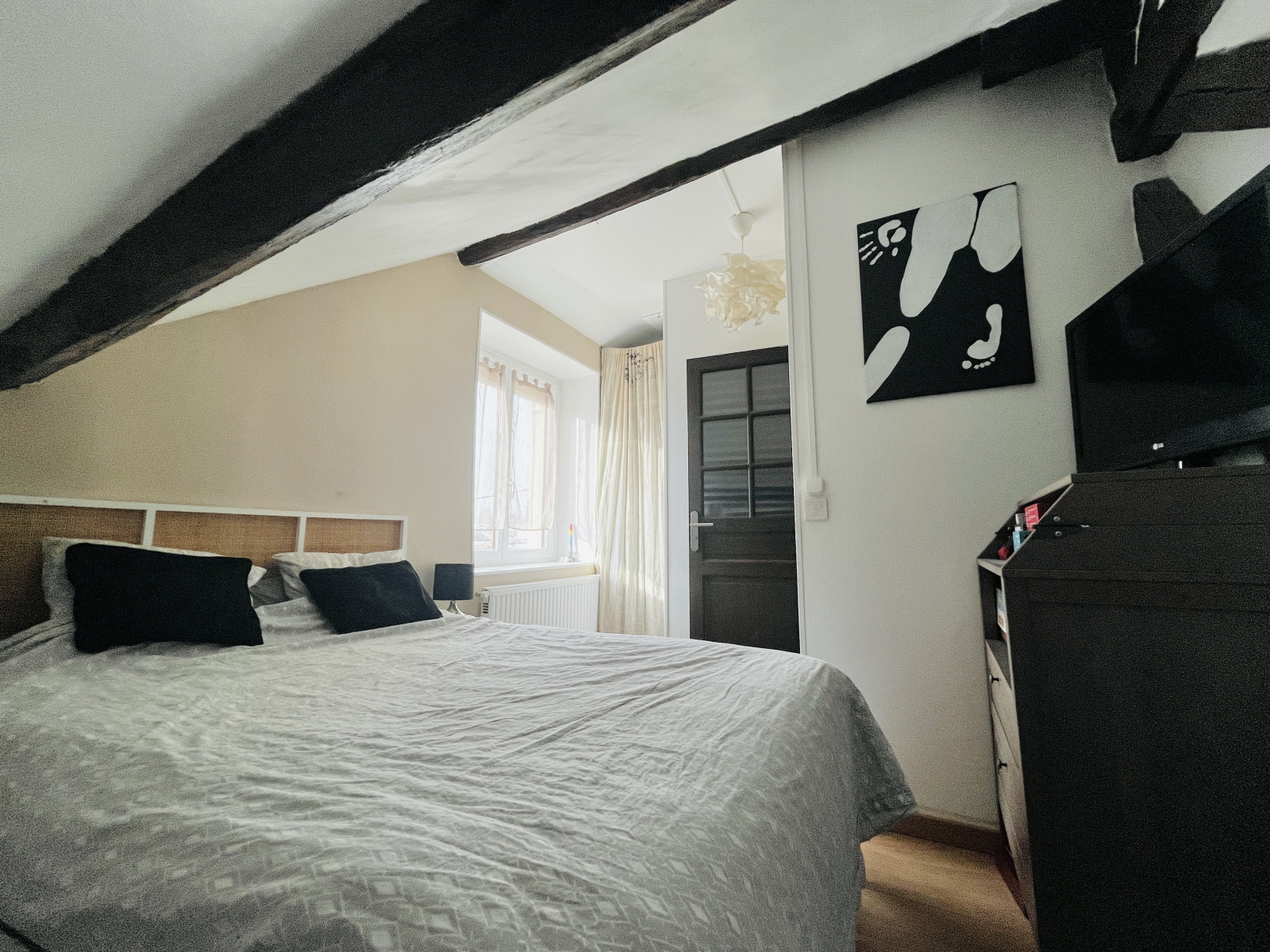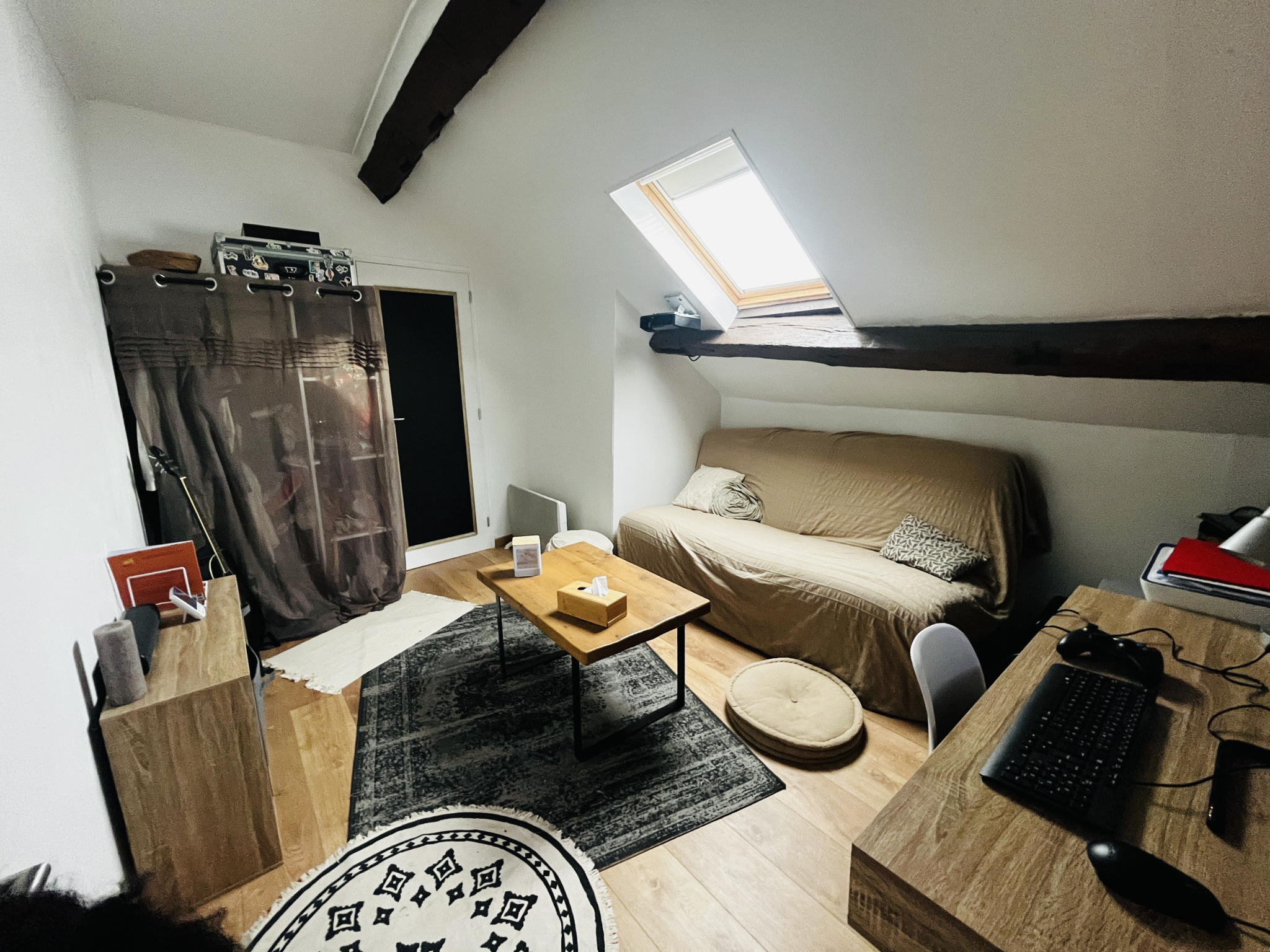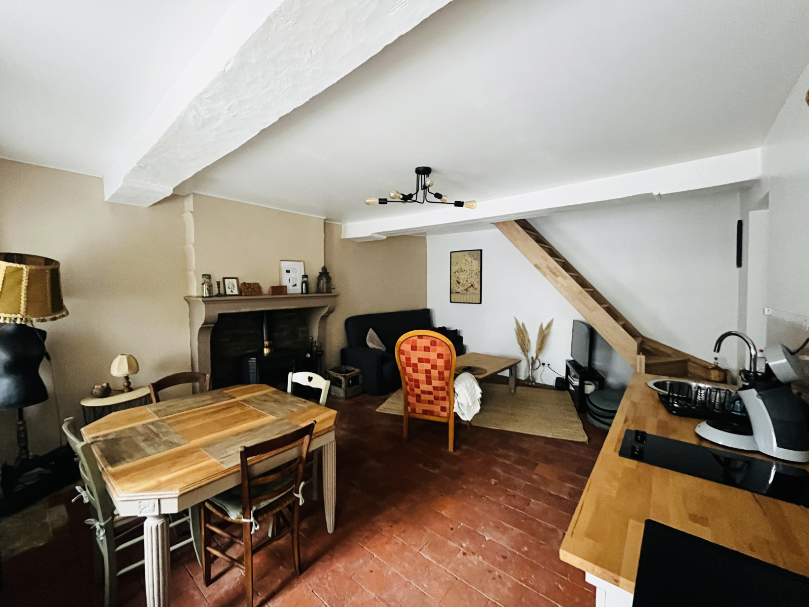 Véritable cocon de presque 44 m2 habitables : vous arrivez sur chaleureuse pièce de vie avec cuisine ouverte, espaces repas et salon, toujours sous le charme de l'ancien. Un dégagement nous amène ensuite à une belle chambre avec placard, et à une spacieuse salle de douche avec WC.