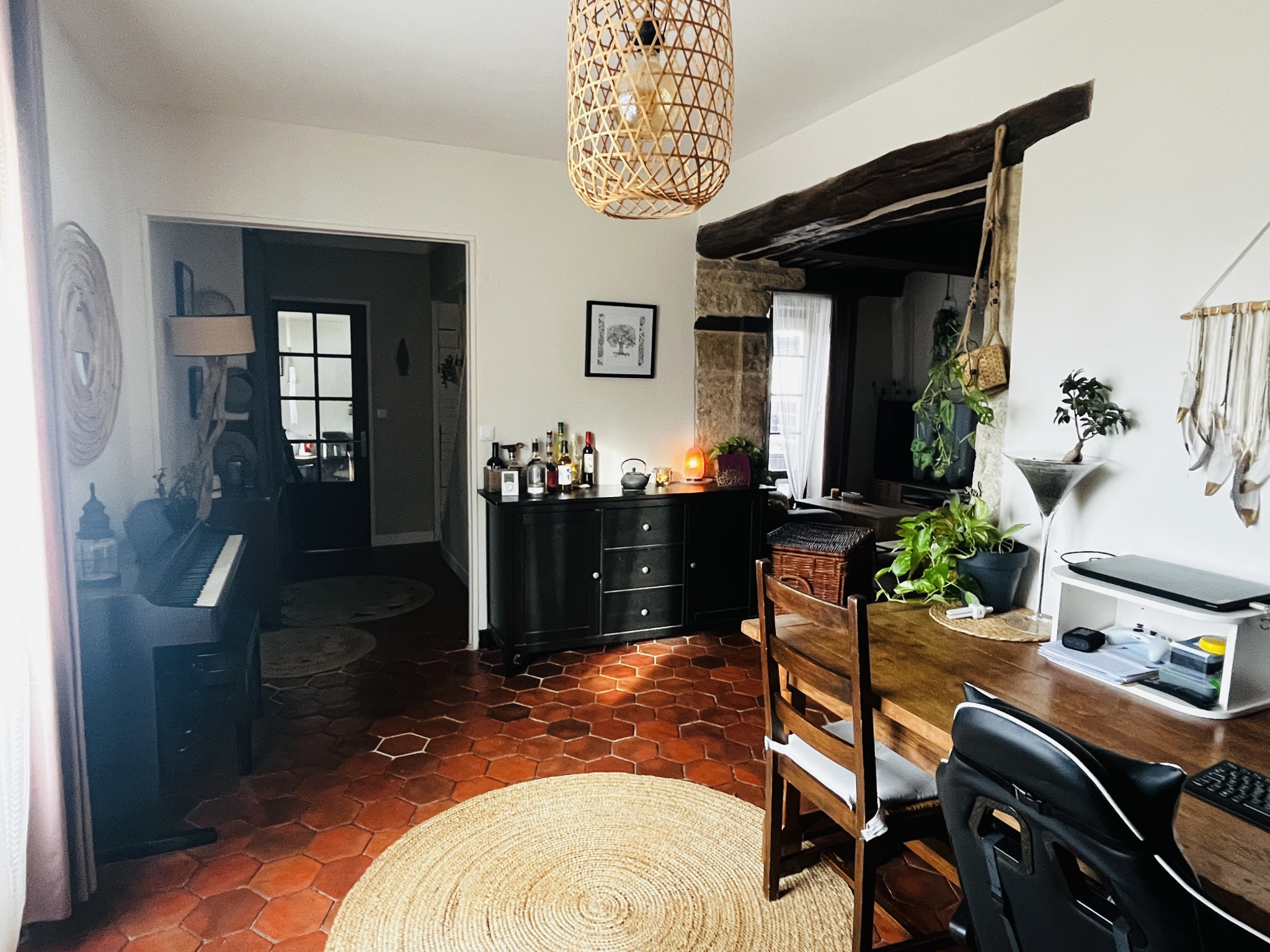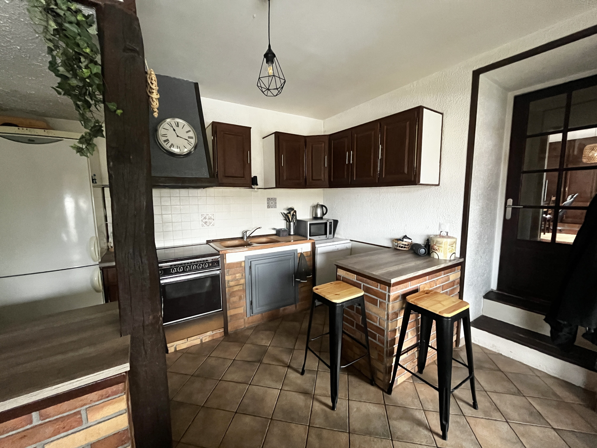 Vous serez forcément séduit par ce nid douillet familial surplombant le village. Vous entrez sur une fonctionnelle cuisine équipée de plus de 12 m2, donnant directement sur une magnifique pièce de vie de plus de 40 m2 : salle à manger (actuellement aménagée en bureau) et un salon cosy, donnant accès à une terrasse intimiste exposée Sud/Ouest. Beaucoup de cachet grâce à la pierre, aux tommettes, cheminée, poutres et boiseries... Sans oublier de nombreux espaces de rangement. Toujours à ce niveau, vous bénéficiez d'une vaste salle de douche, et de WC indépendants. À l’étage, le palier dessert 3 jolies chambres mansardées, et des WC indépendants.