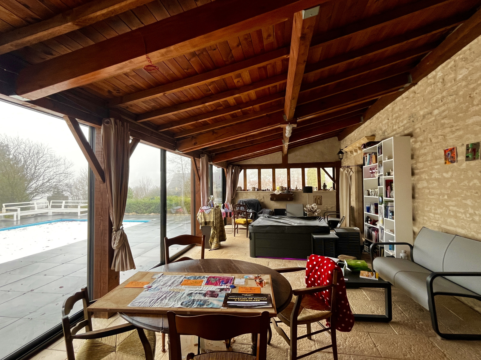 L'entrée donne directement sur une chaleureuse pièce de vie de plus de 70 m2 avec salle à manger, confortable salon face à la cheminée, et cuisine ouverte, aménagée et équipée (avec entre autres : bar, îlot central et arrière cuisine/cellier). Attenante s'ajoute une superbe véranda de plus de 42 m2, permettant un accès sur la terrasse plein Sud avec piscine et vue sans vis à vis sur le jardin.