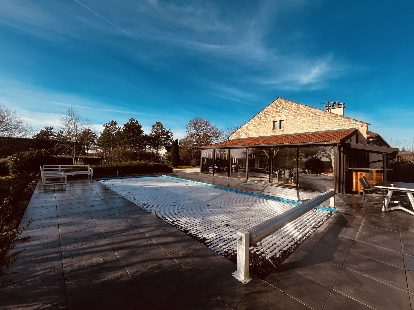 L'extérieur offre également d'autres avantages : depuis le portail motorisé vous bénéficiez d'une cour d'environ 400 m2 exposée Sud/Ouest, puis un carport, un atelier, ainsi qu'un chalet en bois et deux récupérateurs d'eau. Vous pourrez surtout profiter de la terrasse d'environ 130 m2 autour de la piscine de 5 x 11 (avec rideau sécurisé).